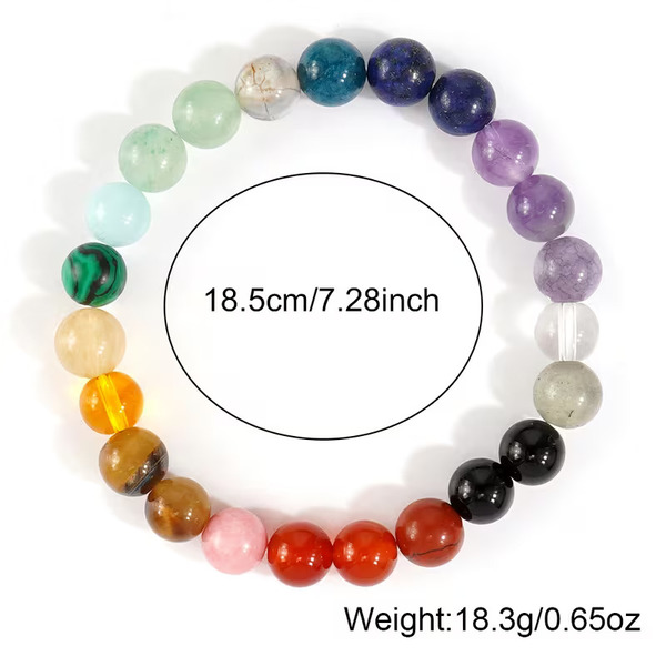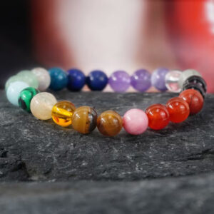 Energijsko izredno močna zapestnica, izdelana iz kvalitetnih kristalov v barvah čaker. Vsak kristal je skrbno izbran in vsak od njih ima pomembno nalogo, saj vsak izmed njih vpliva na določeno čakro. Čakre so energijske točke v telesu, v katerih obstoj že davno ne dvomimo več. Z uravnavanjem čaker poskrbite za svoje fizično, mentalno in duhovno stanje. Kamni vam pomagajo pogumno sprejemati življenjske odločitve, povečati telesno vzdržljivost in zagotoviti zaščito.