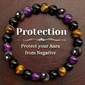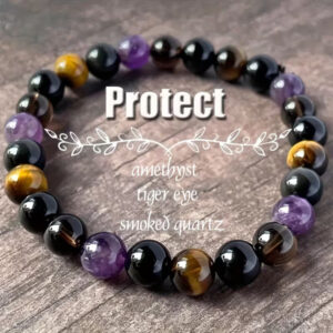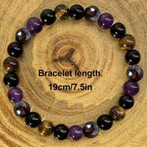 Ročno izdelana zapestnica iz 8 mm kamnov, spodbuja zaščito in srečo (tigrovo oko, obsidian, ametist in dimljeni quartz) za vsakodnevno nošnjo in darilo.